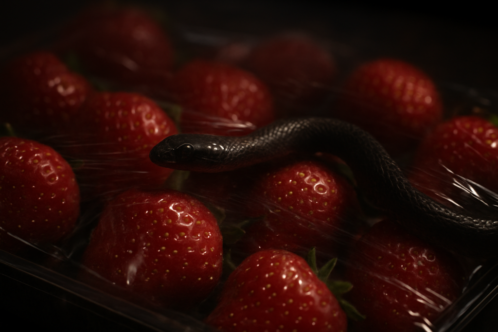 This scene also serves as a metaphor for life. Just as a tray of strawberries can hide a snake, life often presents us with surprises that challenge our assumptions. Observing closely, appreciating contrasts, and maintaining awareness are lessons embedded in this striking visual story.