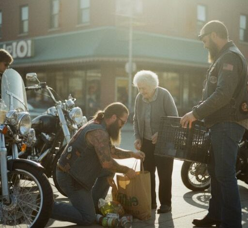 By morning, my fridge held only mustard and two eggs. I bundled up, grabbed my cart, and walked toward the discount store. That’s when I ran into them—the bikers. Leather vests, tattoos, the works. I almost turned back, but when one dropped a bag of cans, I helped him pick them up.