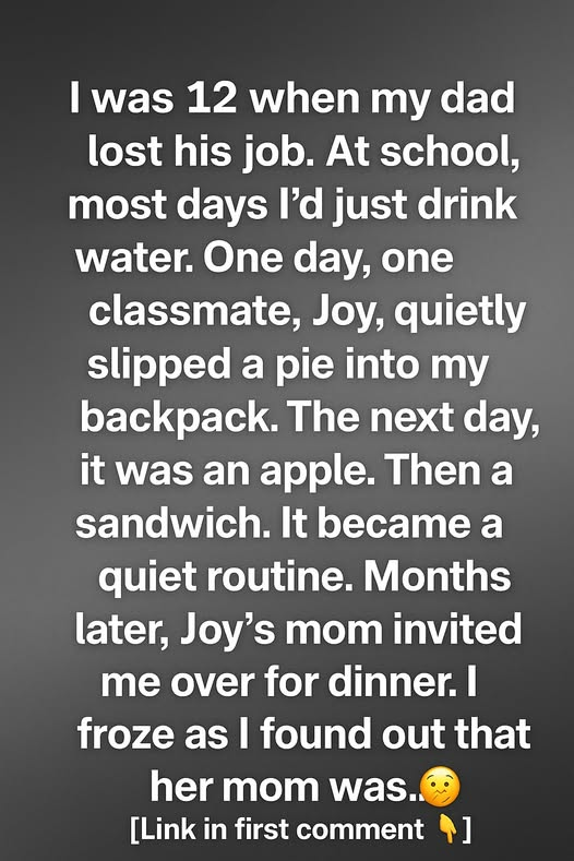 pretending I wasn’t hungry, forcing a smile as my friends chatted around me. It was embarrassing, but I didn’t want anyone to know how tough things were at home.One afternoon, I unzipped my backpack and froze. Inside was a small pie, still warm. I looked around, confused, but no one seemed to notice. The next day, there was an apple. The day after that, a sandwich. It became a quiet, unspoken routine. Whoever was behind it never said a word, and neither did I. But each day, I felt a little less invisible, a little more cared for. Those small acts of kindness gave me hope during a time when everything felt heavy.
