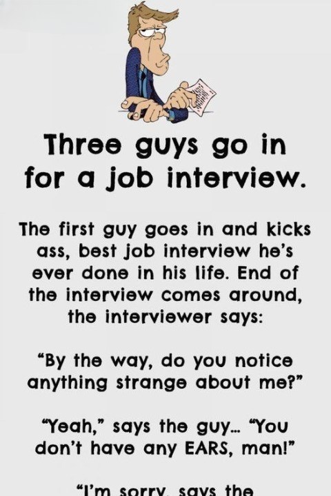 Before the third guy goes in, the first two warn him not to mention the interviewer’s nose. The third guy follows their advice and also does great. When asked if he notices anything unusual, he says, “You wear contact lenses, don’t you?” The interviewer, impressed, asks how he knew. The guy replies, “You’d play hell trying to find glasses to fit that motherfucking nose!”