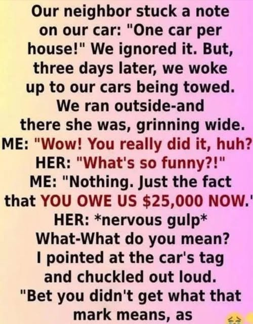 Our new neighbor had been upset about parking since the day we moved in. She believed there should only be one car per house on our street, even though there were no such rules in place. One evening, we found a handwritten note stuck to our windshield. It read: “One car per house! Move the extra one or else!” We laughed it off, thinking it was just an idle threat. After all, both of our cars were legally parked in front of our house, and we weren’t breaking any laws. Three days later, we woke up to the sound of engines and loud clanking outside. When we rushed out, both of our cars were being hooked up to tow trucks.