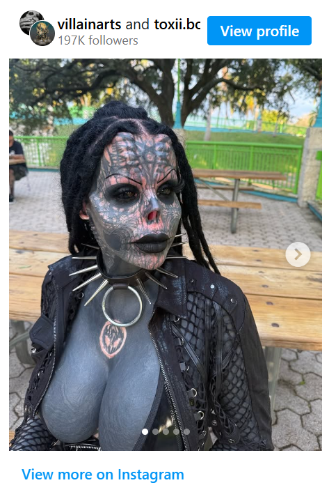 Toxii, a self-proclaimed body modification enthusiast, is now almost completely covered in tattoos, with the upper half of her body entirely blacked out in ink. But that’s just the beginning of her extreme changes.