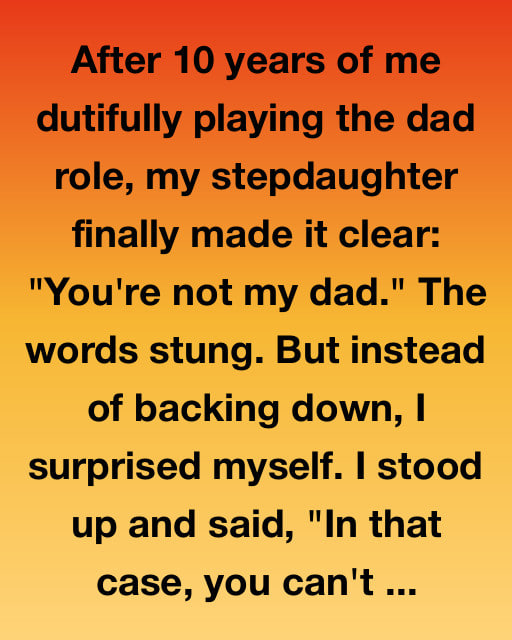 “You’re not my dad.” She said it like a switch flipped. Ten years of scraped knees, school plays, and heartbreaks—all erased. I didn’t get angry. I told her calmly: “Then you don’t get to treat me like a punching bag.” She wasn’t used to me pushing back. Slammed door. Silence. Later, Claire said, “She’s hurting. At her dad. At me. Maybe at you—because you stayed.”