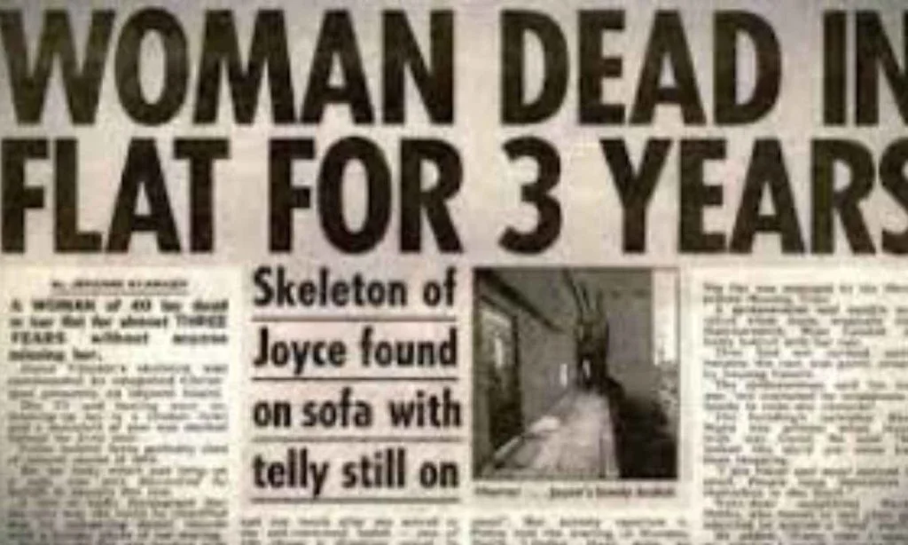 Joyce’s television was eerily broadcasting BBC1 in front of her. A stack of unopened Christmas presents, and undelivered mail, also sat beside her signaling her unnoticed absence. The refrigerator stored food with expiry dates from 2003, showing the length of time she had been gone.
