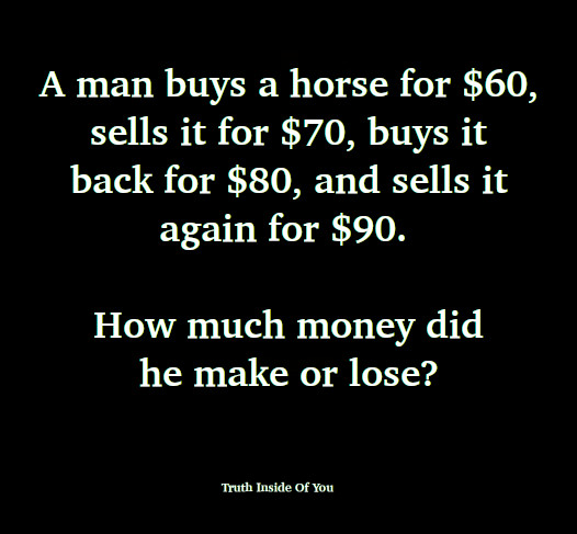 A man buys a horse for $60, sells it for $70, buys it back for $80, and sells it again for $90. How much money did he make or lose?