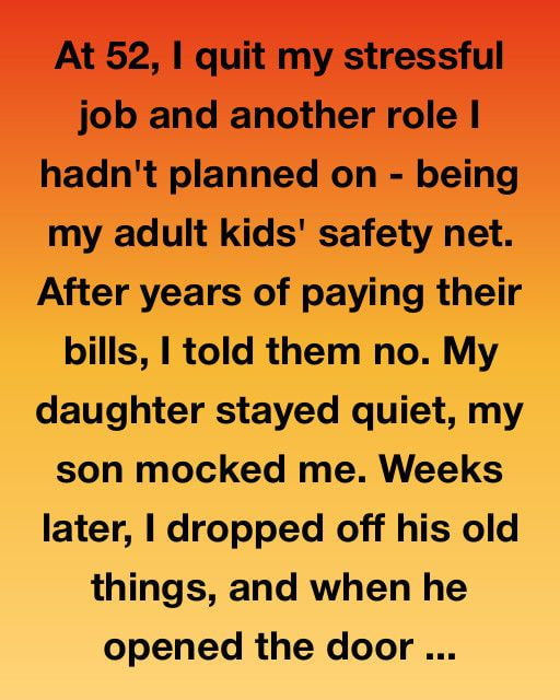 At 52, I quit my stressful job and another role I hadn’t planned on—being my adult kids’ safety net. After years of paying their bills, I told them no. My daughter stayed quiet, my son mocked me. Weeks later, I dropped off his old things, and when he opened the door, he looked tired.