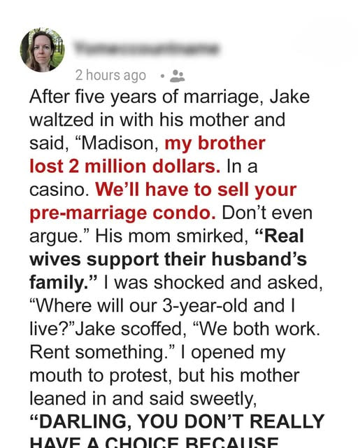 “Sell your condo, Maddie. Family takes care of family,” Patricia said.“