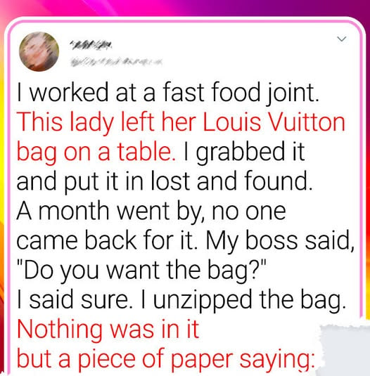 While working at a fast-food restaurant, I noticed a woman had left her Louis Vuitton bag on a table. After waiting for a while and seeing no sign of her return, I took the bag to the lost and found, not thinking much of it. A month later, my manager asked if I wanted the bag, as it hadn’t been claimed.
