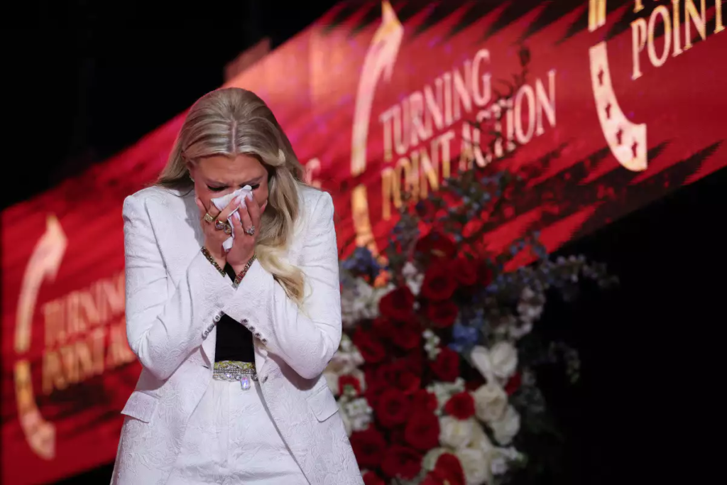 The memorial service for Charlie Kirk had just ended. Hymns faded, mourners drifted out, and the air was heavy with grief. Erika Kirk stood near the altar, pale but composed, greeting friends with faint smiles that masked the storm within her. She had held herself together for hours, but the weight of loss was crushing.