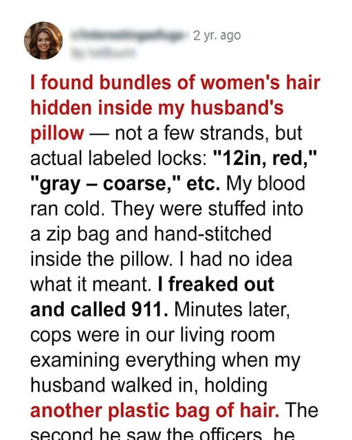 One afternoon while cleaning, I noticed the pillow on the couch looked heavier than usual. Curiosity got the better of me. When I lifted it, I heard a faint rustling sound. My heart pounded as I unzipped the cover and discovered a hand-stitched seam inside. Something was hidden there. With trembling hands, I carefully opened it—and froze. Inside were small plastic bags filled with hair, each labeled neatly with names and dates. I didn’t know whether to be terrified or heartbroken. Fearing the worst, I decided to call the authorities before confronting Travis myself.