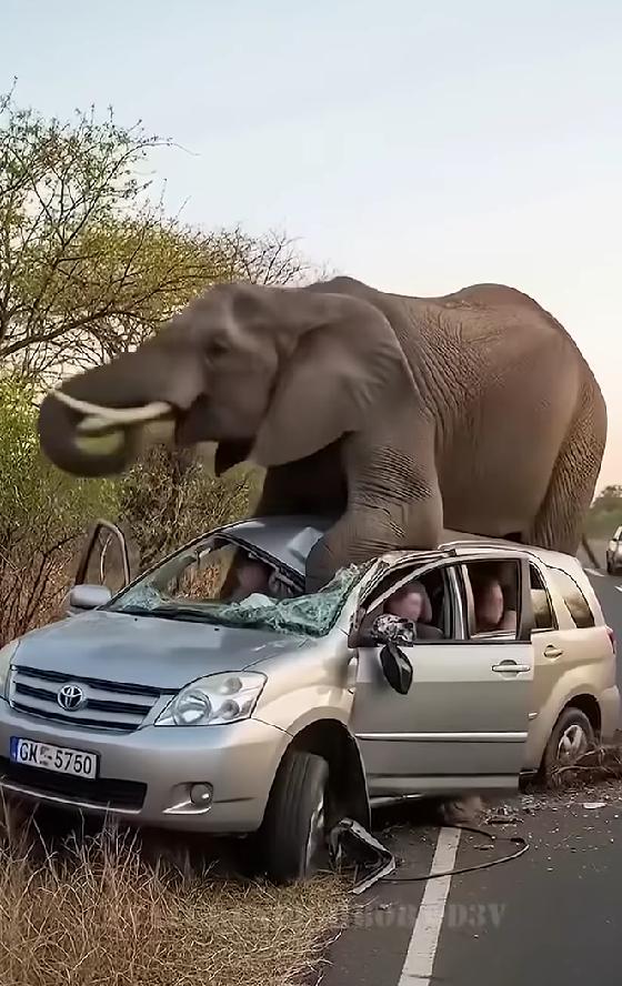 In a heartbeat, the giant closed the distance. The driver barely had time to slow before the elephant placed his trunk on the hood, testing its strength. Then, with terrifying power, he climbed onto the vehicle. Metal crumpled like paper under his weight, the windshield shattering into a spiderweb of cracks.