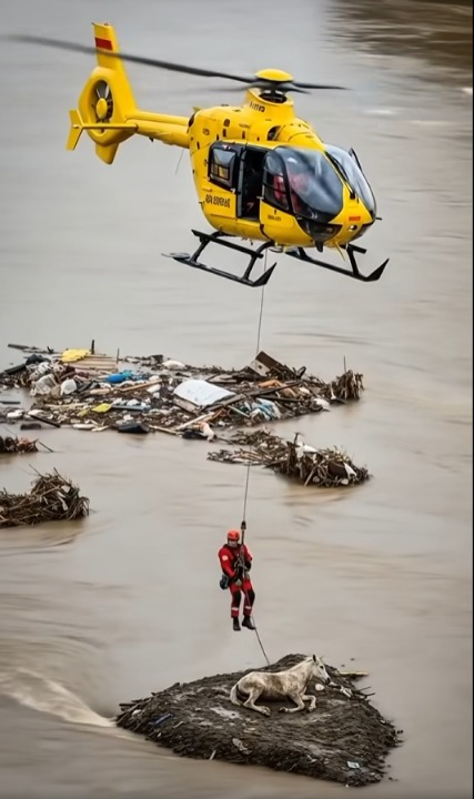 As the helicopter hovered above the floodwaters, rescuers carefully lowered themselves down to the horse’s location. The animal was frightened and exhausted but responded to the calm and steady efforts of the team. Using specially designed harnesses, the rescuers secured the horse and prepared it for the lift.
