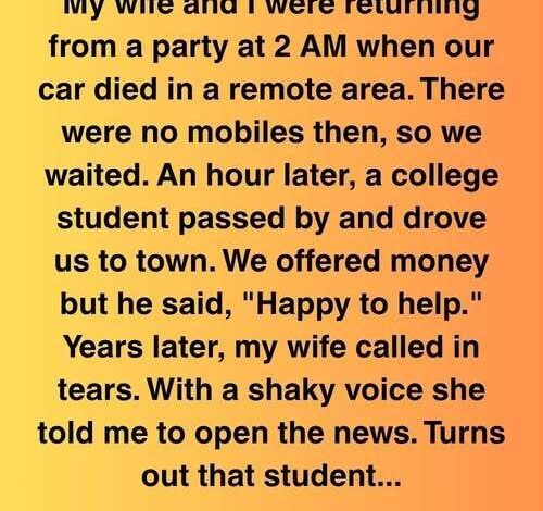 It was 2 AM. My wife and I were driving home from a party when our car sputtered and died on a remote stretch of road. No cell phones back An hour passed before a beat-up Toyota Corolla pulled over. A college student stepped out—lean frame, kind eyes, worn hoodie. He asked if we needed help. We offered money. He smiled and said, “Happy to help.” Then he drove us to town.then. Just silence, stars, and the hum of waiting.