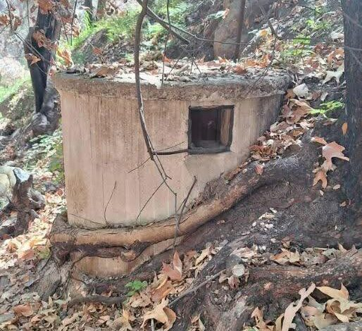 It may, at first glance, look like a bunker or a misplaced utility box. But the thick walls and narrow opening also suggest something else. This was probably a former hillside water cistern — the kind of large pit used decades earlier to collect and store rainwater or spring water for the use of nearby homes, farms or even finger” livestock.