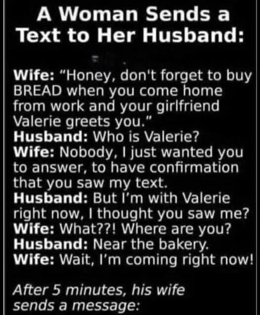 husband’s attention by sending a text implying he’s with another woman named Valerie.