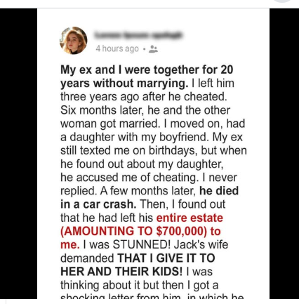 My ex never truly let go. His occasional messages went unanswered as I protected my peace. When he learned I had a daughter, his anger resurfaced, and our last exchange ended painfully. Months later, news of his sudden passing reached me. The shock was followed by confusion when a solicitor contacted me: my ex had left me the majority of his estate, despite having a wife and a child on the way.
