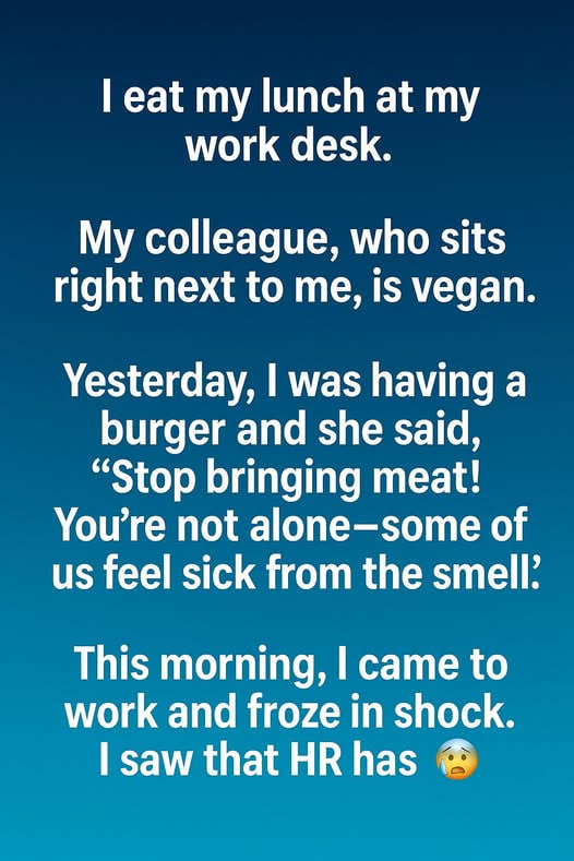 So the next day, I took my lunch to the break room. To my surprise, she stopped by later with a smile and a homemade vegan cookie. “Thanks for understanding,” she said. I smiled back and realized that sometimes, kindness isn’t about who’s right — it’s about choosing respect over ego. That small moment reminded me that workplaces run smoother not just because of rules, but because of empathy. A little consideration can turn tension into understanding — and even friendship.