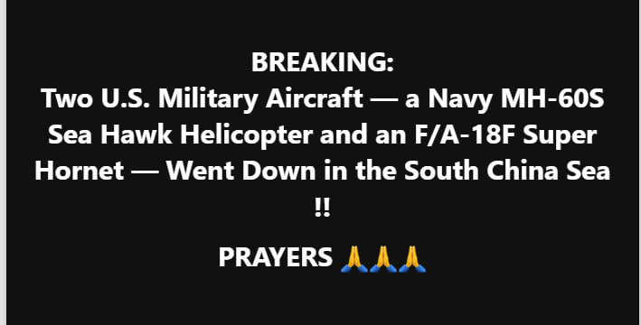 Breaking News: Two U.S. military aircraft have crashed in the South China Sea, as confirmed by the U.S. Pacific Fleet. The aircraft involved include a Navy MH-60S Sea Hawk helicopter and an F/A-18F Super Hornet. The incident occurred recently, and the details are still unfolding.