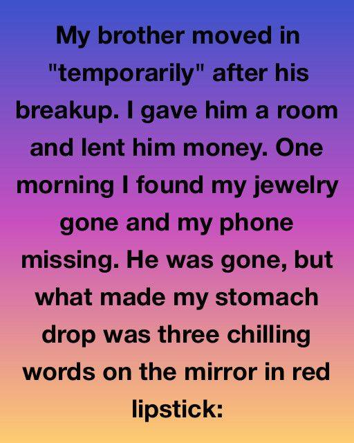 My brother moved in “temporarily” after his breakup. I gave him a room and lent him money, only to wake one morning to find my jewelry and phone gone. On the mirror, in red lipstick, three words chilled me: “Don’t Trust Family.”