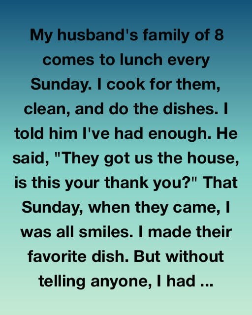 For three years, every Sunday at noon, my husband’s family arrived at our house—chatty, hungry, and expectant. Behind the laughter, I did it all: cooking, serving, cleaning. I was invisible.