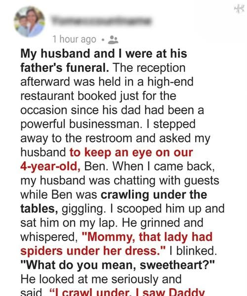 At the funeral reception, my four-year-old son Ben wandered off, giggling beneath the tables. When I found him, his smile was gone. He tugged my dress and whispered, “Mommy… I saw Daddy touch another lady’s leg.” His small finger pointed to Rachel — my husband Arthur’s longtime friend. I froze, trying to convince myself Ben was mistaken, but the whisper stayed with me. That night, doubts grew into certainty. Old emails revealed late-night messages, hotel bookings, and months of deception. I gathered every receipt, contacted a lawyer, and quietly prepared my escape. In the end, Ben’s innocence gave me the courage to reclaim my life.
