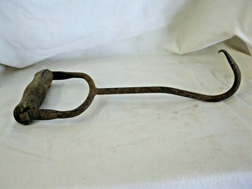 The hay hook, often forged from iron or steel, dates back to the 19th century when it became an essential tool in agriculture. Before the advent of mechanized farming equipment, this tool was invaluable for moving and handling hay bales. Its design features a curved, pointed hook that allowed farmers to grasp and maneuver large quantities of hay with ease