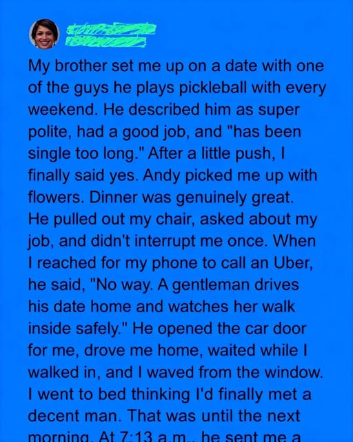 At 7:13 a.m., Andy sent a cheerful message thanking me for the evening and asking if I’d like to go hiking that weekend. I smiled at his enthusiasm, but before I could reply, another message followed. This one was longer and more thoughtful. He shared that he’d spent the morning reflecting on our conversation and felt grateful to have met someone who listened, laughed, and spoke openly.