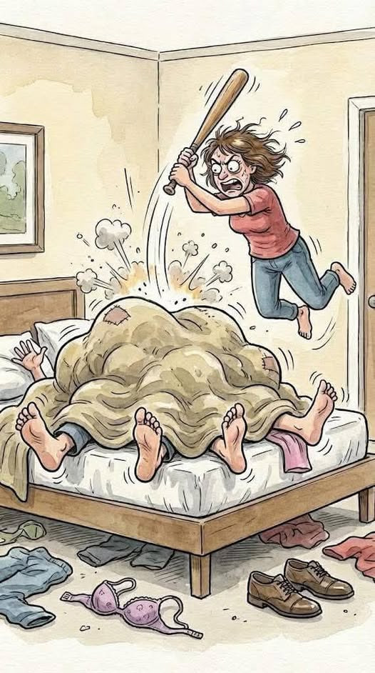 Wife comes home late at night and quietly opens the door to her bedroom. From under the blanket she notices four legs instead of two!…