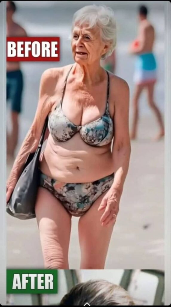 At first glance, this image shocks many people because society rarely shows older bodies with confidence. What happened here is not about perfection or age reversal, but about a woman choosing comfort and freedom over judgment. The picture challenges the idea that only young or “perfect” bodies deserve to be seen in public spaces like the beach.