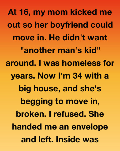 Now, at thirty-four, I own a large house and run a successful landscaping business. Last week, my mother appeared at my gate, worn down and asking if she could move in. I refused. She didn’t argue—she handed me an envelope and left.