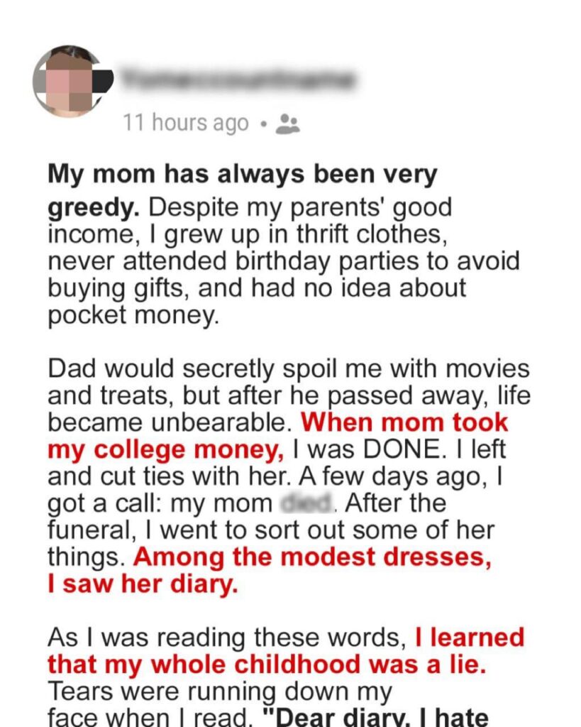 It wasn’t until after mom die:d that I found the truth. Cleaning out her house, I stumbled upon an old, worn-out diary tucked away in a drawer. Curious, I started reading.