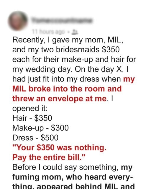 MIL Demands That Bride Pays for Her Wedding Hair, Makeup & Dress – Bride’s Mom Overhears & Confronts Her