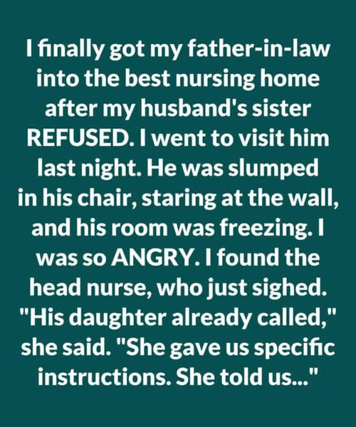 I was the one who finally got my father-in-law into a good nursing home—after my late husband’s sister refused to help. When I visited one evening, he sat slumped in his chair, distant. What struck me first wasn’t his expression. It was the cold. The room felt like a refrigerator.