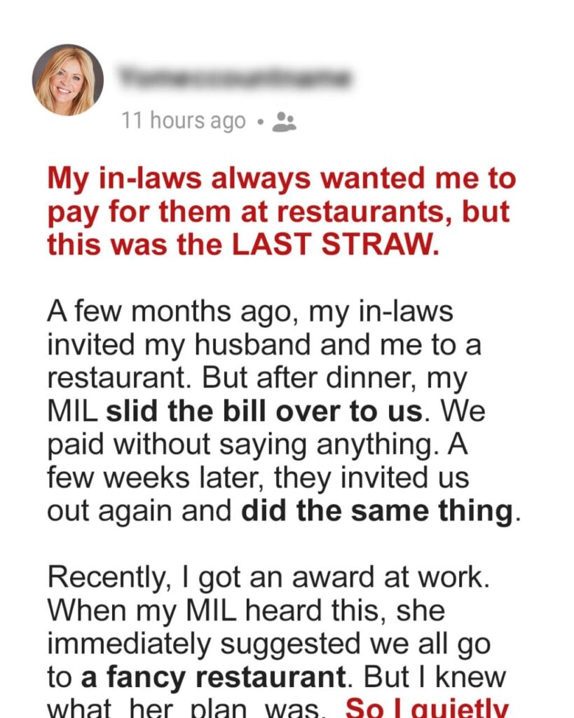 When the waiter finally brought the bill, my MIL didn’t hesitate to slide it over to us with a saccharine smile. “You’ve had such a wonderful achievement, dear. It’s only fitting you celebrate by treating us,” she said.