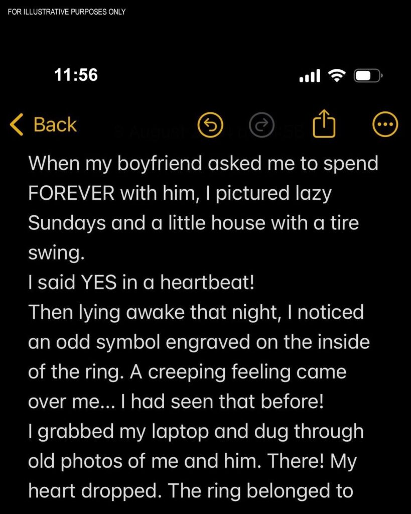 Emma, a talented graphic designer, had been in a relationship with Daniel, a businessman, for three years. They were having dinner at an upscale restaurant, enjoying each other’s company, when Daniel suddenly became nervous. Taking her hand, he told Emma how happy she made him and how he wanted to spend the rest of his life with her. He then presented a ring and asked her to marry him. As she gazed at the ring, a peculiar pattern caught Emma’s attention, triggering an unsettling memory. She felt a wave of doubt but masked her emotions, responding that the ring was beautiful even though a voice inside her warned of betrayal.