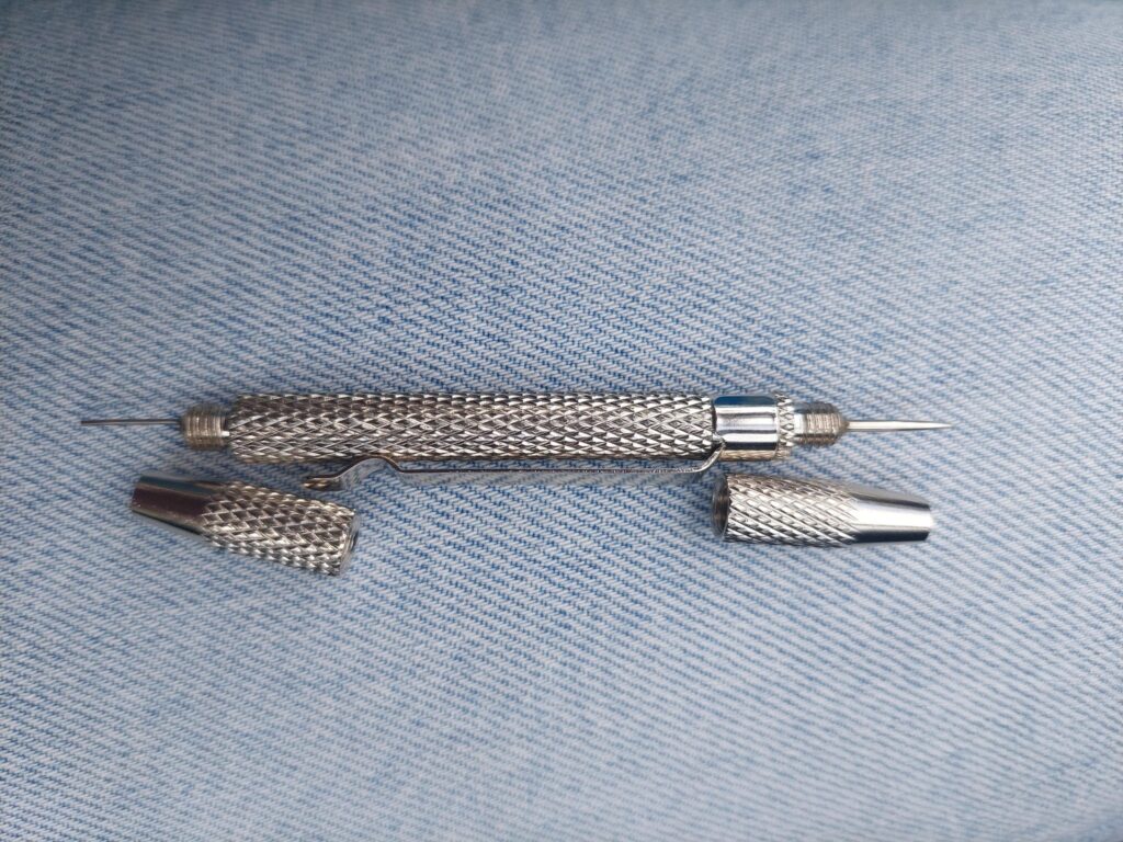 A metal, pen-like object around 12 cm long with one sharp end and one blunt end.