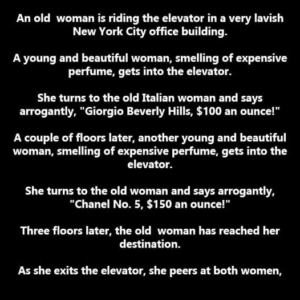 An old woman is riding the elevator in a very lavish New York City office building. A young and beautiful woman, smelling of expensive perfume, gets into…