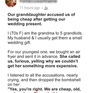 Jen and her husband, in their 70s, cherished their five grandchildren. It was their tradition to buy the cheapest item from the wedding registry and gift the…