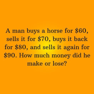 If a man buys a horse for $60, sells it for $70, buys it back for $80, and sells it again for $90, the trick is to…