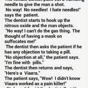 The dentist starts to hook up the nitrous oxide, and the man objects. No way! I can’t do the gas thing. The thought of having a mask…