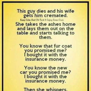 After her husband dies, the wife gets him cremated and takes the ashes home. She sets them on the table and starts talking: “You know that fur…