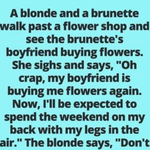A blonde and a brunette walk past a flower shop and see the brunette’s boyfriend buying flowers. She sighs and says, “Oh crap, my boyfriend is buying…