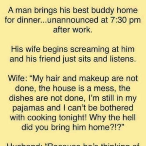 A man brings his best buddy home for dinner… unannounced at 7:30 pm after work. His wife begins screaming at him and his friend just sits and…