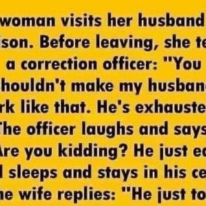 A woman visits her husband in prison. Before leaving, she tells a correction officer: “You shouldn’t make my husband work like that. He’s exhausted!” The officer laughs…