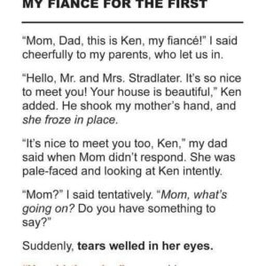 “Mom, Dad, this is Ken, my fiancé!” I said cheerfully as we entered. “Hello, Mr. and Mrs. Stradlater. It’s so nice to meet you! Your house is…