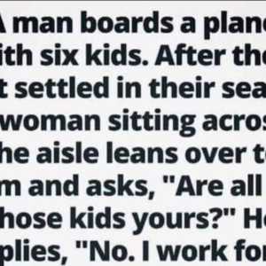 A man boards a plane with six children. After they get settled in their seats, a woman sitting across the aisle leans over to him and asks,…