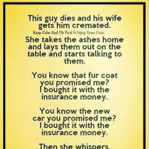 This guy dies and his wife gets him cremated. She takes the ashes home and lays them out on the table and starts talking to them. You…