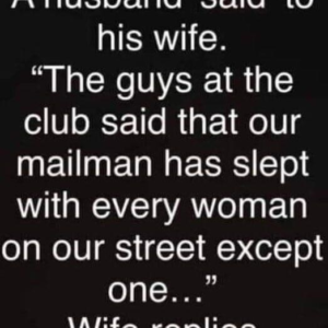 A husband said to his wife. “The guys at the club said that our mailman has slept with every woman on our street except Wife replies “I…
