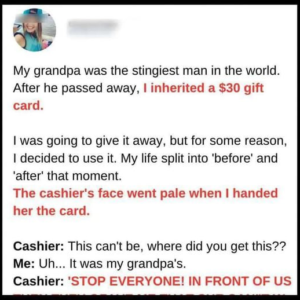 My grandfather was the world’s most cheap person. I got a $30 gift card from him after he d!ed. For some reason, I chose to use it…