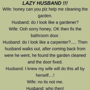 Wife: honey can you plz help me cleaning the garden. Husband: do I look like a gardener? Wife: Ooh sorry honey, OK then fix the bathroom door….
